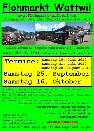 Es gibt noch zwei letzte Flohmärkte in Wattwil, dem Samstag 25. September 2010 und dem Samstag 16. Oktober 2010